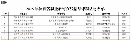 近日,陕西省教育厅公布2025年职业教育在线精品课程认定名单,我院亢菊侠教授主持的《作物病虫害防治》课程成功入选。截至目...