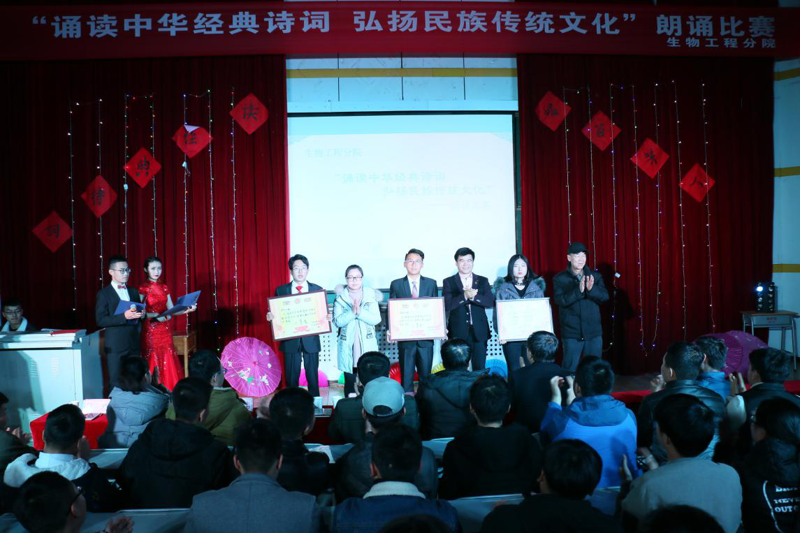 最后,食品营养与检测17023班朗诵的《我用残损的手掌》以丰富的肢体语言、面目表情及或深沉或高昂的音调吸引着观众为此掌声不断荣获一等奖,农产品质量检测17024班《沁园春·长沙》、生物技术17055 班《行路难》荣获二等奖,生物技术17056班《春江花月夜》、绿色食品生产与经营17014班《西洲曲》、园艺技术17052班《致橡树》荣获三等奖,各位领导及老师为获奖队伍颁奖。