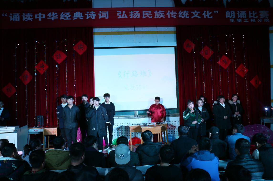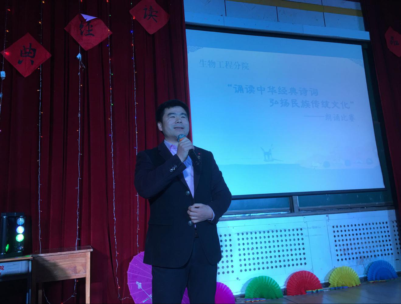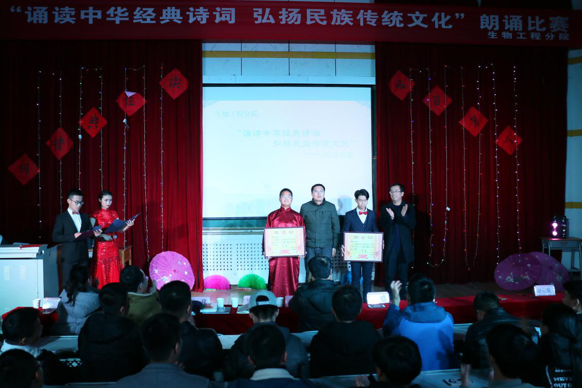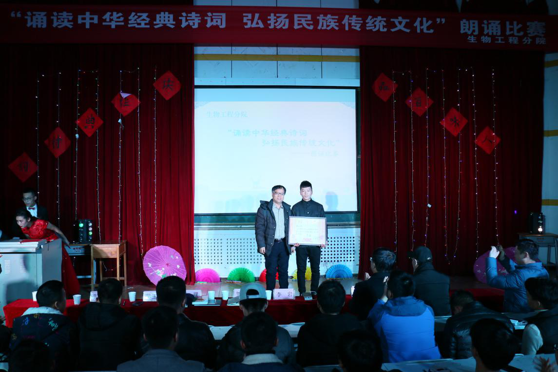 为弘扬中华传统文化,全面提升我院师生的道德境界和人文素质,确保将经典晨读活动落到实处,同时也为了检验本学期经典晨读活动成果,我院于12月20日晚七点在西台阶教室举办了“诵读中华经典诗词,弘扬民族传统文化”朗诵比赛。学院团委副书记、办公室主任候煜、我院党总支副书记李岩、学工办副主任贺立虎、我院知名专家杨凌皇普园林工程有限公司董事长黄璞、全体辅导员以及学生共300余人观看了本次朗诵比赛。