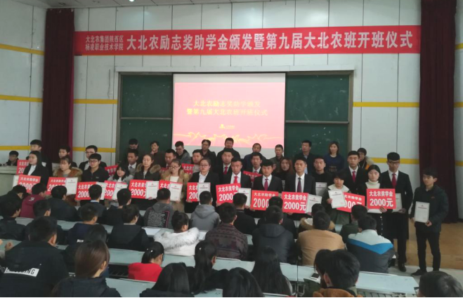 12月25日下午,大北农励志奖学金暨第九届大北农班开班仪式在西校区台阶教室举行,为动物工程分院和生物工程分院的25名优秀学生每人颁发了2000元大北农励志奖学金。大北农集团陕西区总经理宋安石,动物工程分院、生物工程分院负责人,订单班学生以及学生代表350余人参加了奖学金颁发与开班仪式。