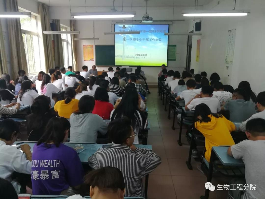 9月2日下午3时,我院在林和楼146教室召开新学期学生干部大会,出席本次大会的有党总支书记李岩、学工办主任贺立虎、全体辅导员,团总支学生会各部门干部、各班长、团支书等参加会议,本次大会由学工办主任贺立虎主持,会上全面安排部署2018年下半年学生工作。