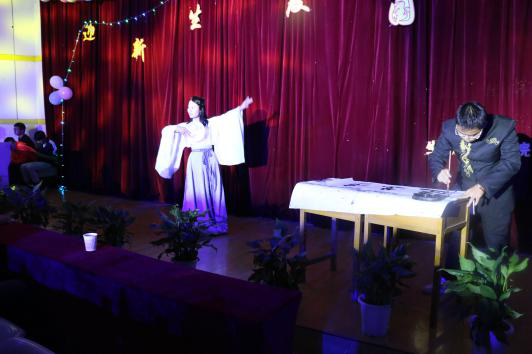 接下来是张旭数的舞蹈《半壶纱》,在每一个娴熟的动作里是表演者背后汗水的注入,音乐清婉,舞者也深陷其中,让我们感受歌中词意,配合着秦琪的书法,使整个节目更完整更具有艺术,引起了场下一阵又一阵的掌声。