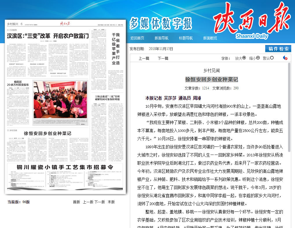 1993年出生的徐恒安是汉滨区吉河镇的一个普通农家娃,当许多90后抢着进入大城市之时,徐恒安却选择了不同的人生——回到家乡种菜。2013年徐恒安从杨凌职业技术学院毕业后到湖北打工,做过农药业务代表,后来开了一家农药经营店。今年初,汉滨区鼓励农户及农民专业合作社大力发展周期短、见效快的高山露地辣椒产业,从种苗、肥料、技术和销路给予一系列政策优惠。听到这个消息,徐恒安坐不住了,他萌生了回到家乡发展绿色蔬菜的想法。说干就干,今年3月,25岁的徐恒安从湖北省宜昌市回到家乡,和高中同学李超一起,在李超的家乡大沟河村,流转了200亩地,开始尝试在这个山大沟深的贫困村种植辣椒。