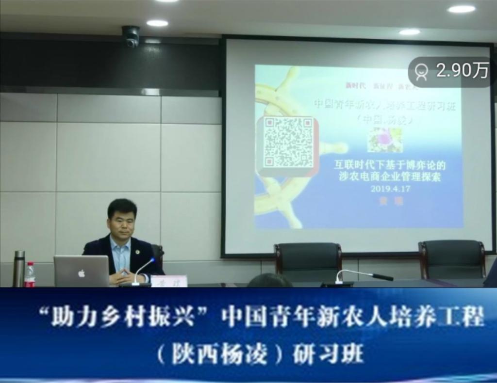 4月17日,由团中央中国农村青年致富带头人协会、中国电商联盟共同举办的“助力乡村振兴"中国青年新农人培养工程研习班在陕西杨凌示范区开班。我院教师、团中央中国农村青年致富带头人常务理事、中国青年企业家协会会员、杨凌青创学院副院长黄璞同志,做了题为《互联时代基于博弈论的涉农电商企业的经营管理模式探索》全网直播专题讲座,受到了来自全国广大学员的好评,收到了数万人的网上观看学习。