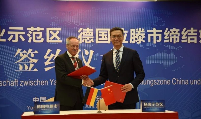 签约仪式上,李九红、卡尔•汉斯•韦伯分别致辞,分别介绍了各自城市的基本情况、城市特点和发展趋势。示范区党工委副书记、管委会常务副主任李九红与德国拉滕市市长卡尔•汉斯•韦伯共同签署了《中国杨凌—德国拉滕缔结姊妹城市关系合作意向书》。管委会副主任陈亚平主持签约仪式。