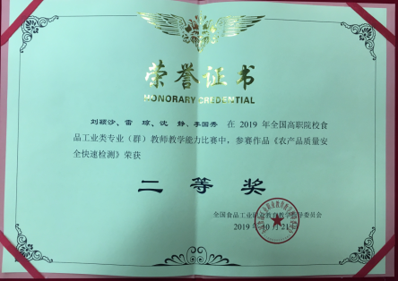 10月21日,我院刘颖沙、雷琼、沈静、李国秀教师团队的作品《农产品质量安全快速检测》荣获2019年全国高职院校食品工业类专业(群)教师教学能力比赛专业二组二等奖。在闭幕式上,团队代表刘颖沙进行优秀作品的授课展示。