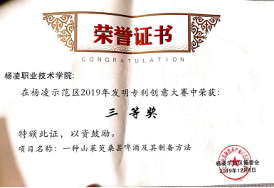 12月6日,杨凌示范区2019年发明专利创新创意大赛决赛成功举办,我院教师姚瑞祺的发明专利“一种山茱萸桑葚啤酒及其制备方法”最终荣获创意组三等奖。