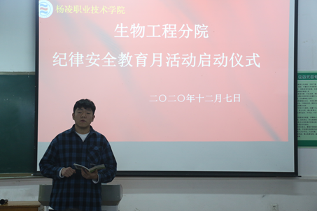 为了强化学生安全纪律意识,增强学生自律守纪能力,促进学生良好行为习惯养成,进一步优化校园环境,保障校园安全稳定,营造良好的育人环境,着力构建优良校风学风,提升学生的教育管理效果,生物工程分院于12月7日下午5点在林和楼146举行2020年纪律安全月活动启动仪式。