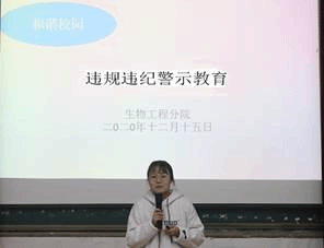 为了促进校园文明安全建设,加强学生遵规守纪教育,预防校园不安全事件发生,生物工程分院于12月15日晚,在西台阶教室举办了违规违纪警示教育大会,使让同学们了解规章制度,强化安全意识,提高避险能力。